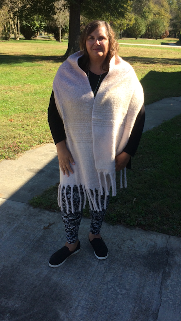 I was able to use my new scarf during our family picture time, too. It was a windy, chilly afternoon and we were outside for a couple of hours. I was so glad that I had brought the scarf with me because I had to pull it out and wrap up in it. It was so warm and the perfect size to keep me warm. The color tones in this scarf are perfect...light mauve. I will be using this scarf all winter while sitting with my class during recess.